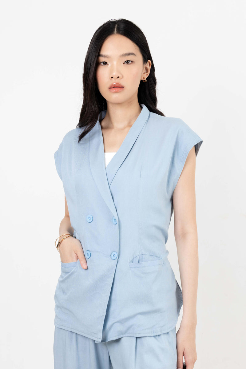 V-neck, sleeveless, single button, and loose fit. Available in three colors: Light Blue, Grey & Medium Blue. Model wears size S; height 175 cm.