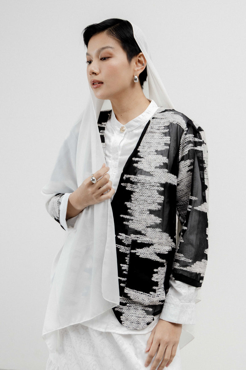 Loose collar, middle length sleeves, front single buttoned, abstract pattern details, & regular fit. Available in five colors: Khaki, Black-Broken White,Broken White, Black-Broken White, Black & Black-Khaki. Model wears size S ; height 170cm.