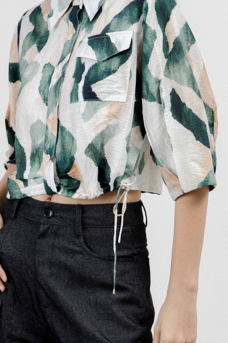 Regular collar, middle length sleeves, hidden buttoned, crop cutting with sided drawstring detail & regular fit. Available in two colors: Green & Black. Model wears size S ; height 170cm.